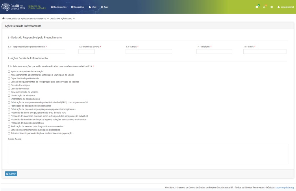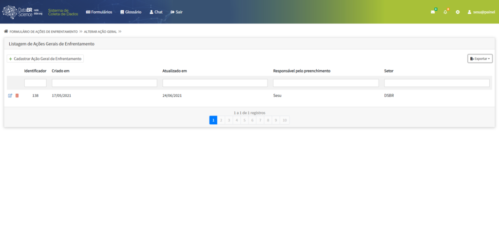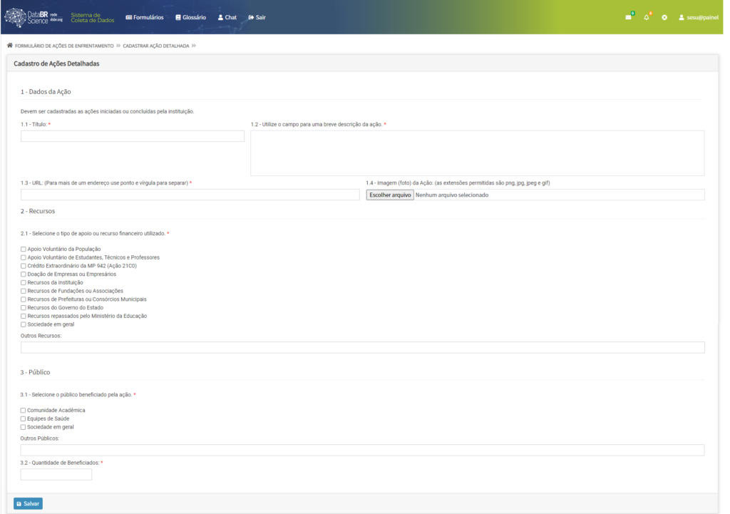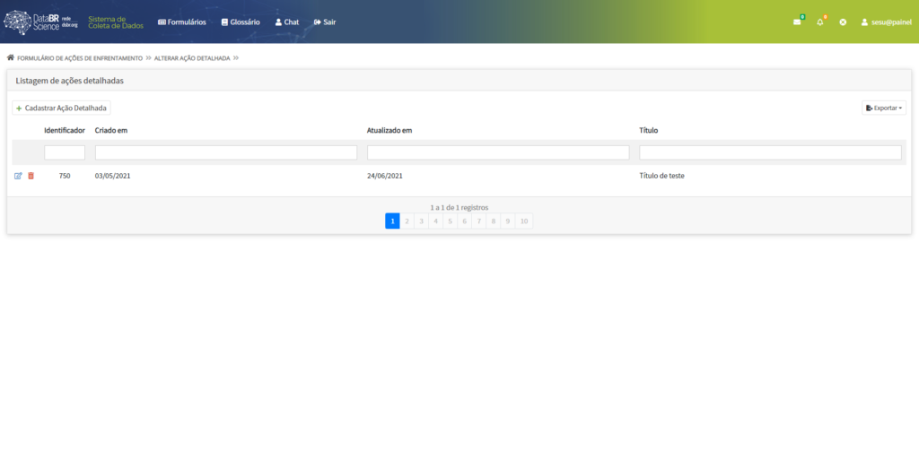 3. Clique no botão localizado no canto superior esquerdo Formulário > Ações de Enfretamento > Ações Detalhadas > Criar.